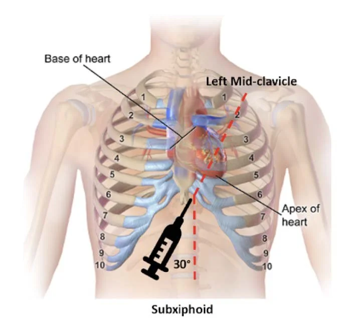 Figure 3. Apical approach - Figure 1. Subxiphoid approach - Source: NUEM Blog — Pericardiocentesis (nuemblog.com)