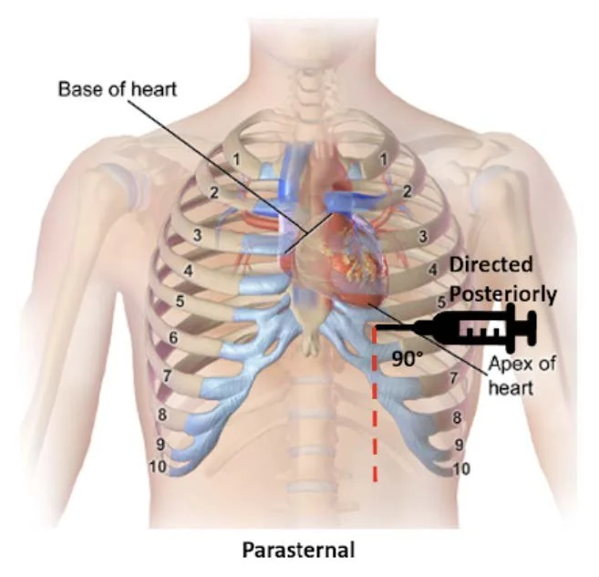 Figure 2. Parasternal approach - Source: NUEM Blog — Pericardiocentesis (nuemblog.com)