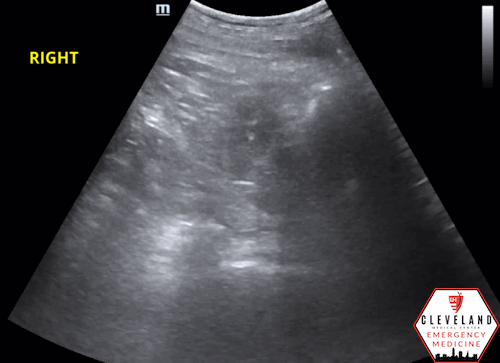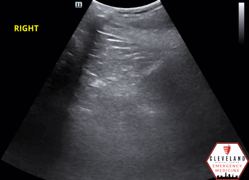 Longitudinal: Place the probe in the right mid-axillary line between the 10th-11th intercostal space, with the indicator toward the patient’s head. Rotate slightly counterclockwise to try to avoid rib shadows.